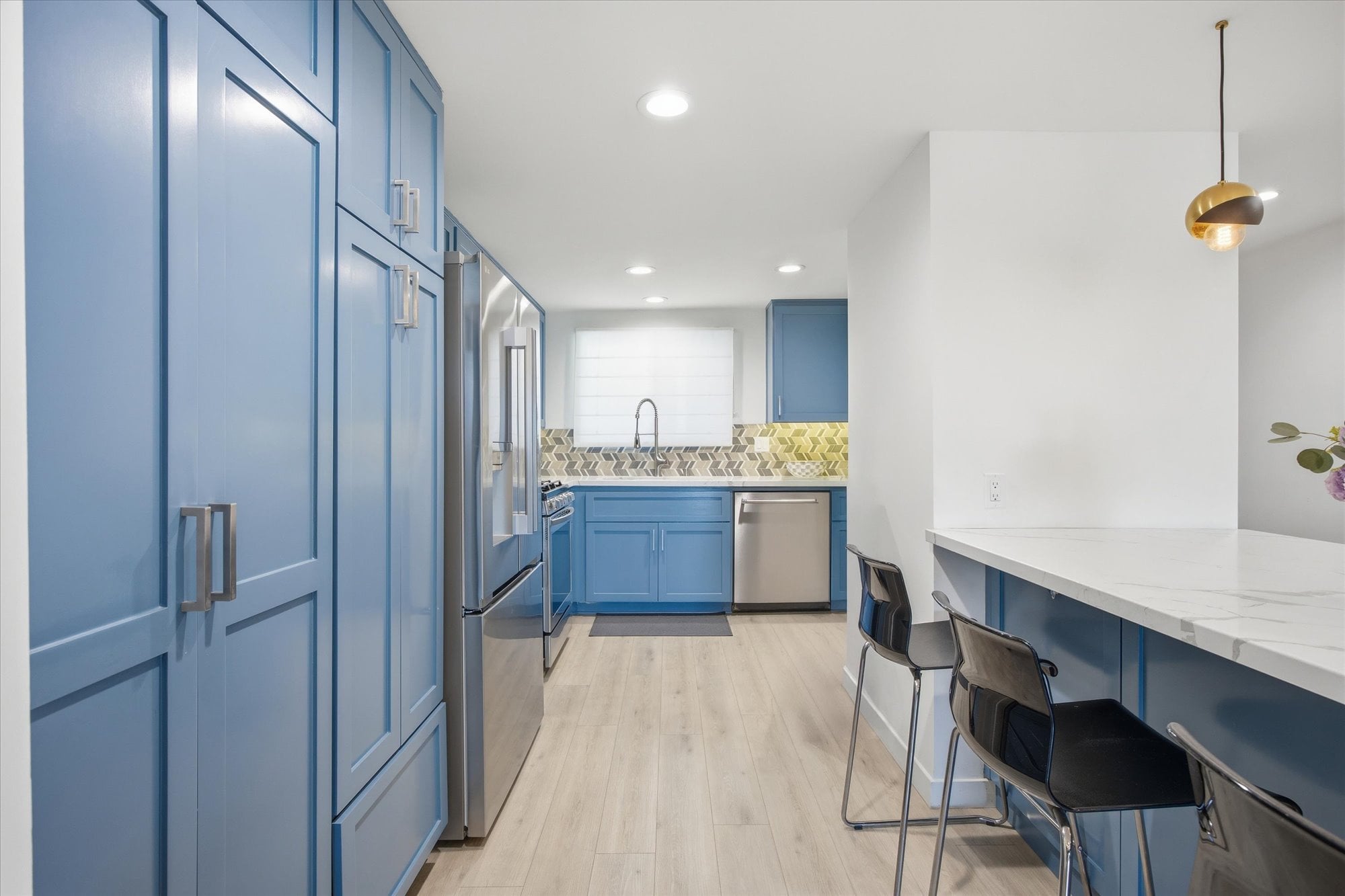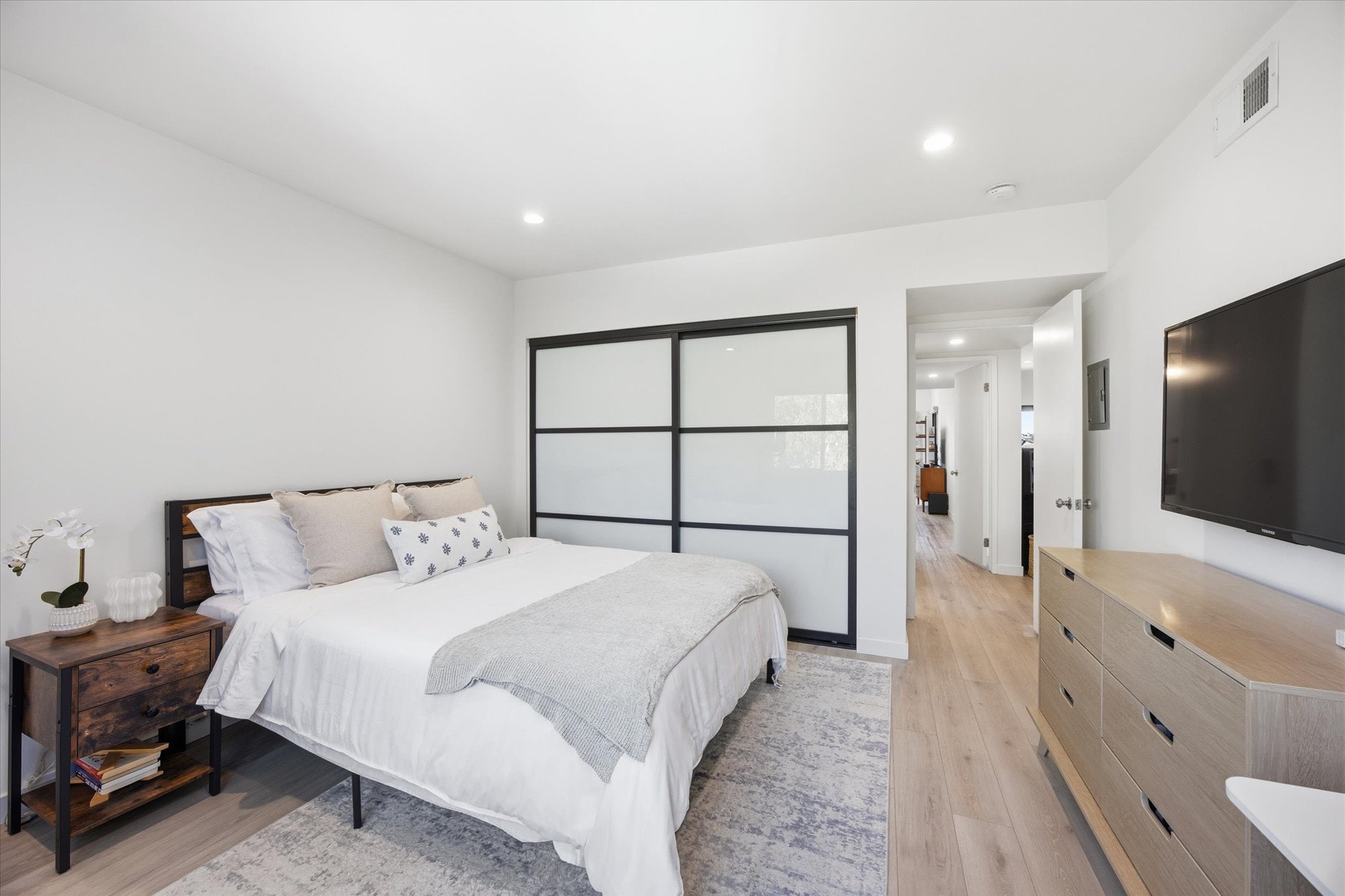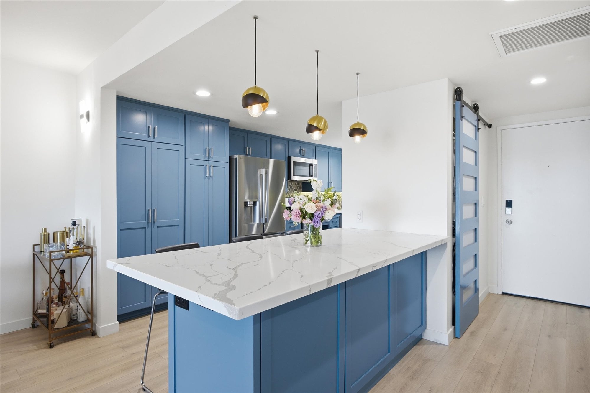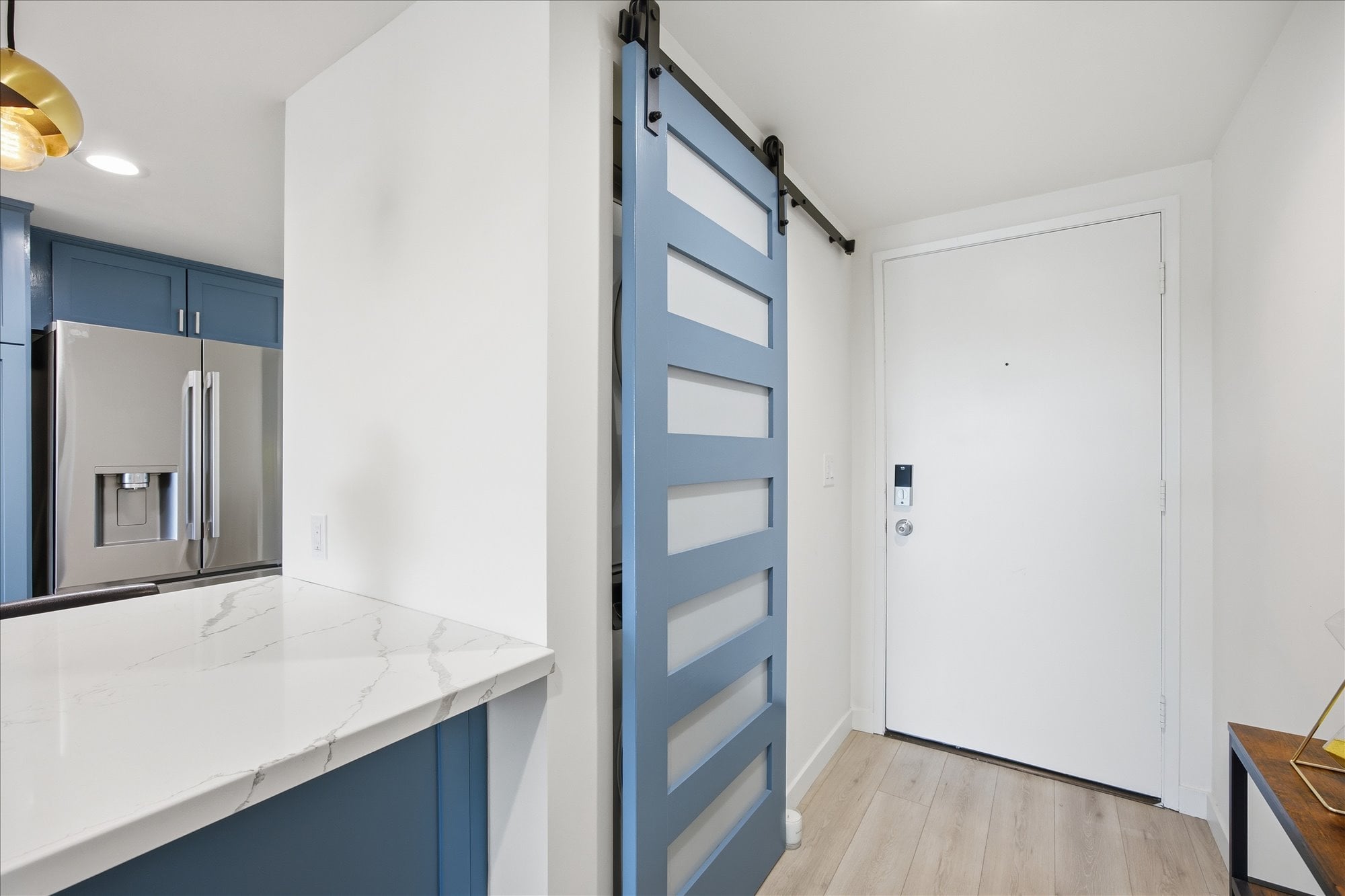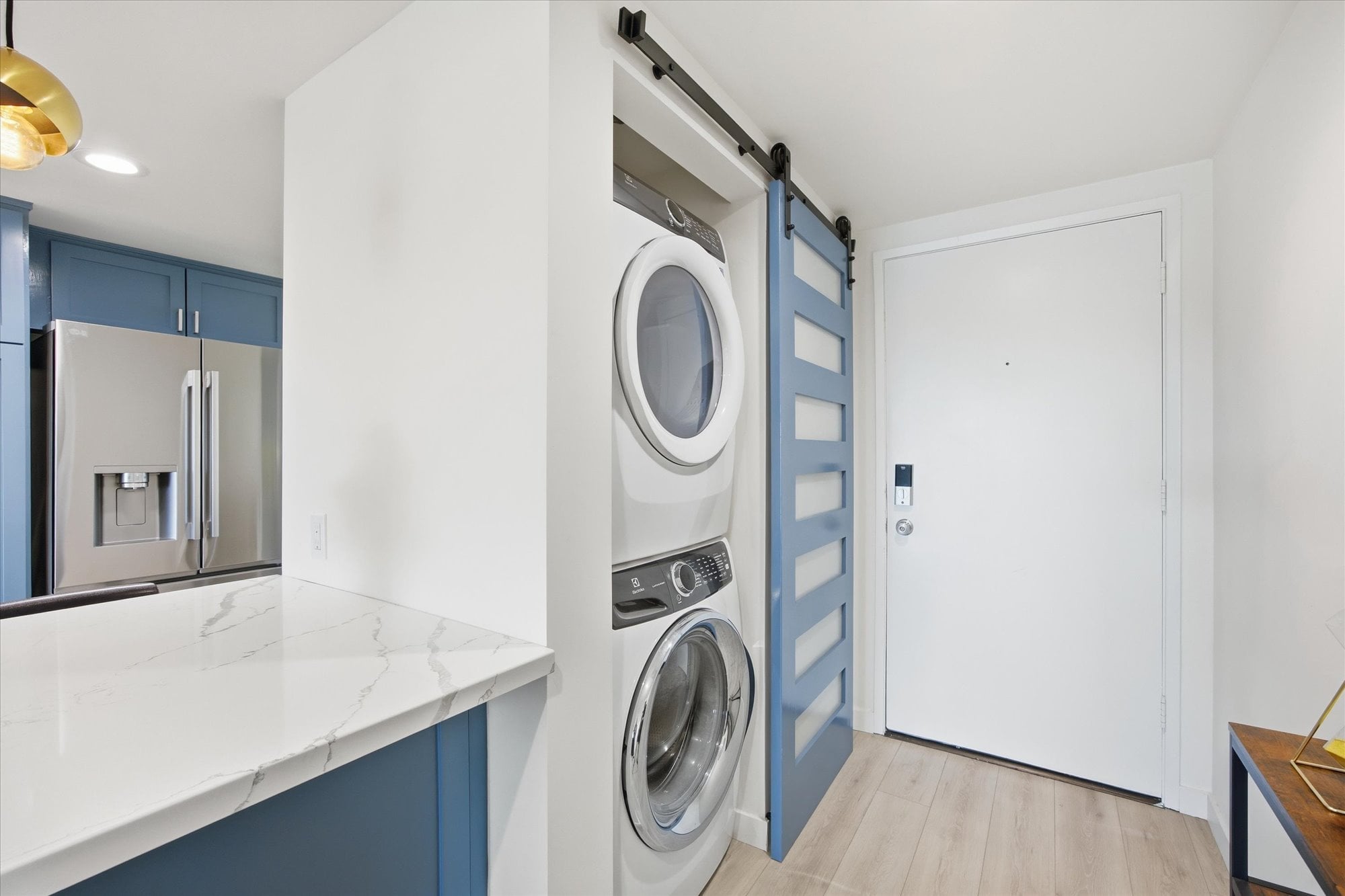 Down the hall, two well-appointed bedrooms offer comfort and privacy, including a spacious primary suite with a walk-in closet, en-suite bath, and direct access to the balcony. Additional thoughtful upgrades include central A/C, recessed lighting connected to a Lutron smart system for effortless app-based control, and an in-unit stacked washer and dryer tucked behind a stylish barn door.