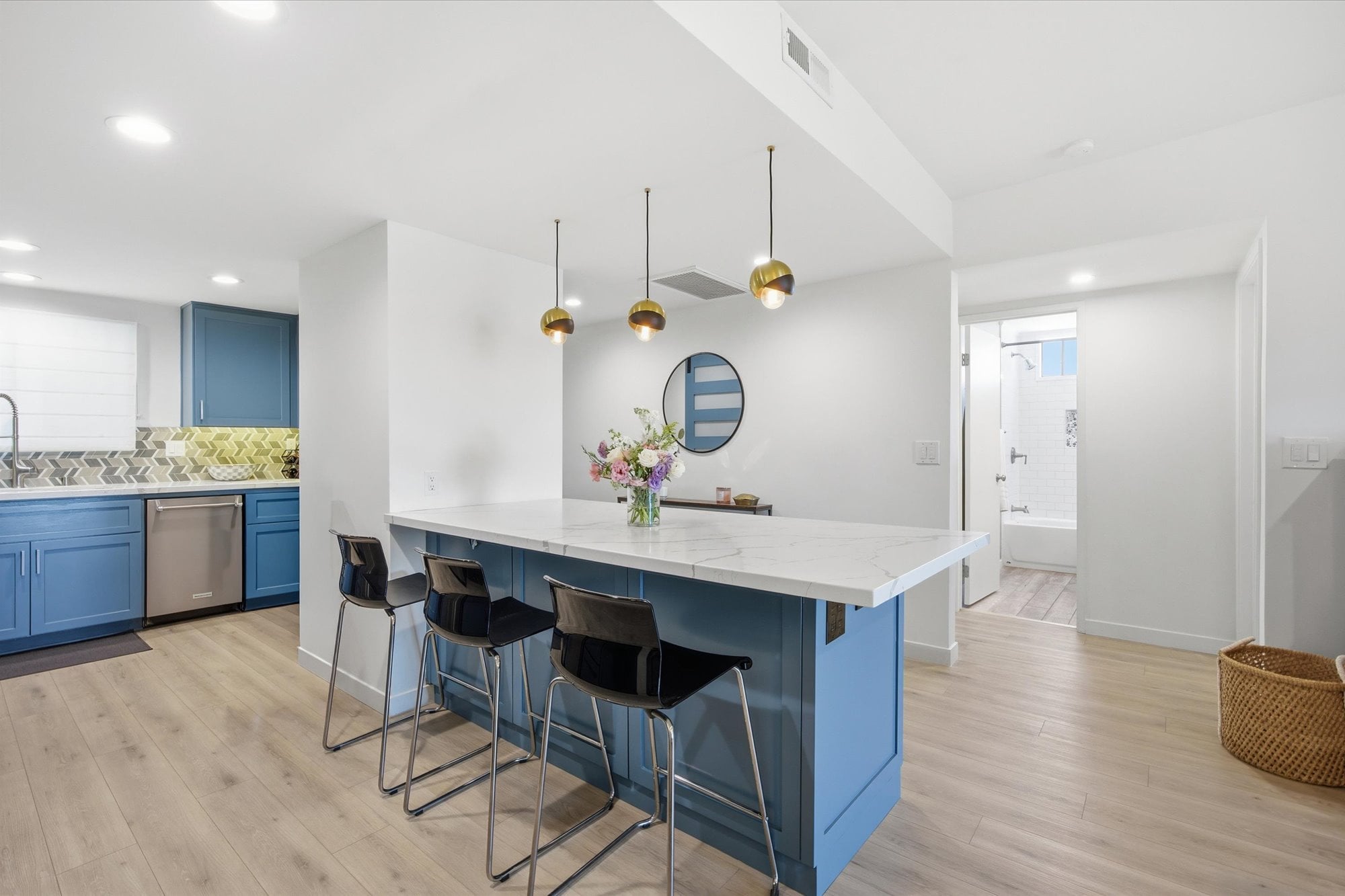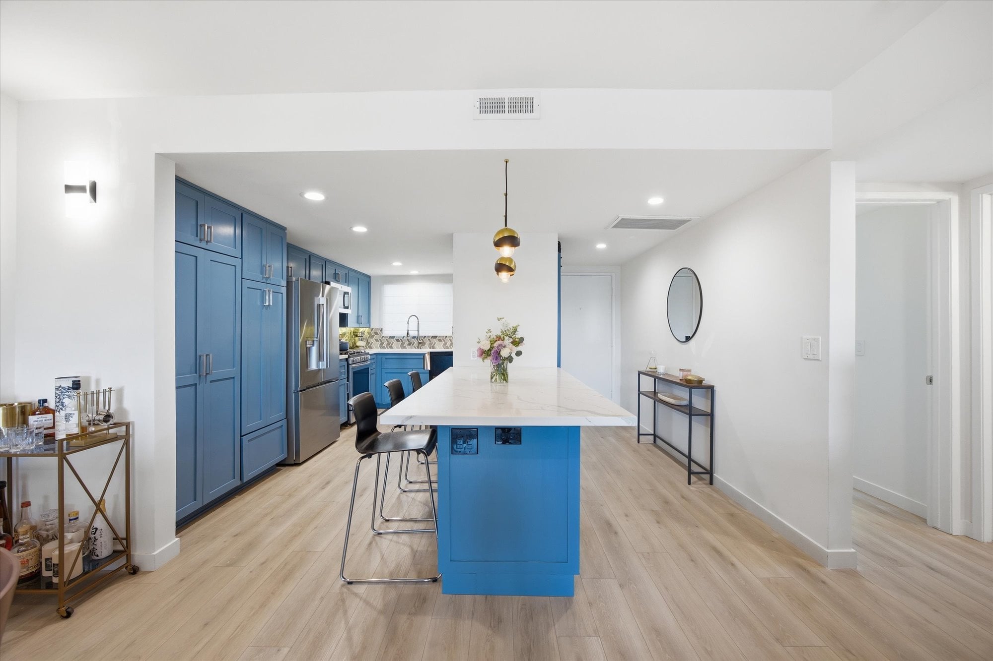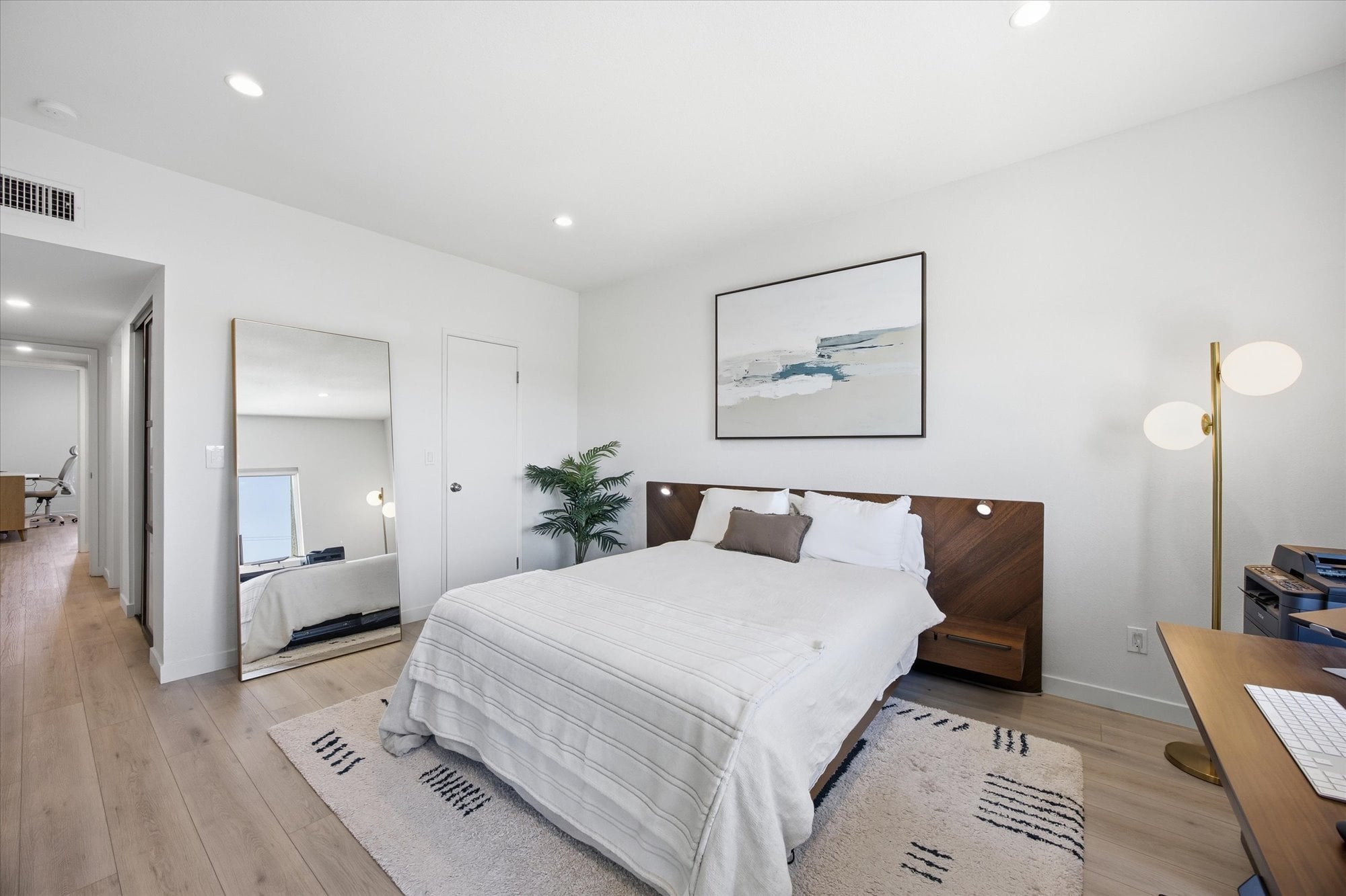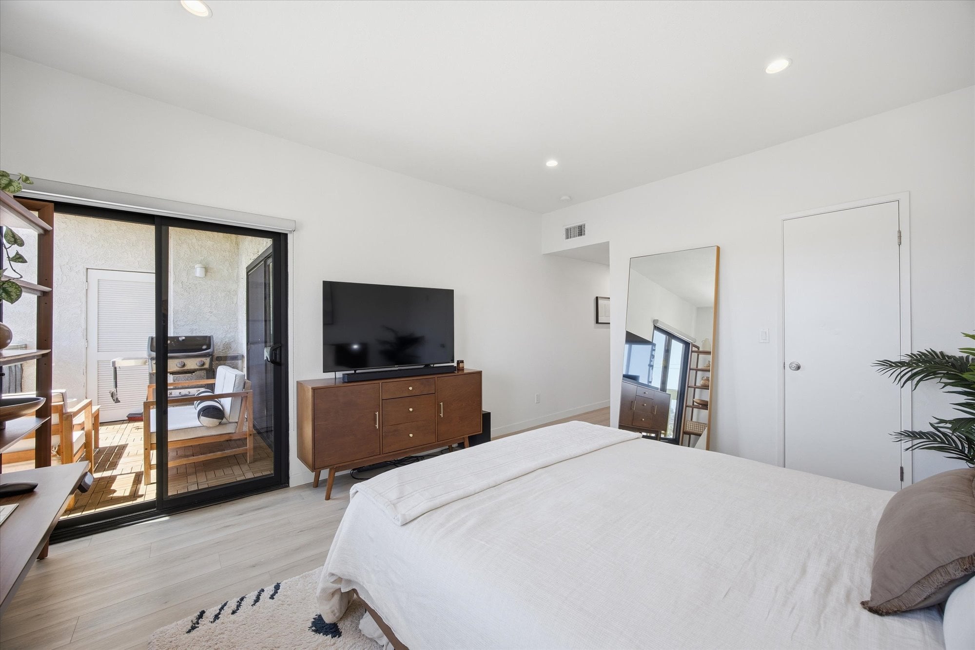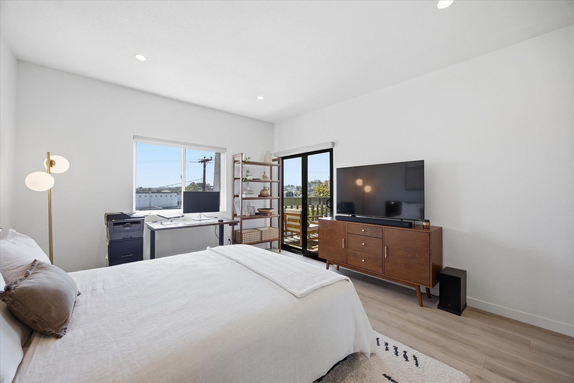Down the hall, two well-appointed bedrooms offer comfort and privacy, including a spacious primary suite with a walk-in closet, en-suite bath, and direct access to the balcony. Additional thoughtful upgrades include central A/C, recessed lighting connected to a Lutron smart system for effortless app-based control, and an in-unit stacked washer and dryer tucked behind a stylish barn door.