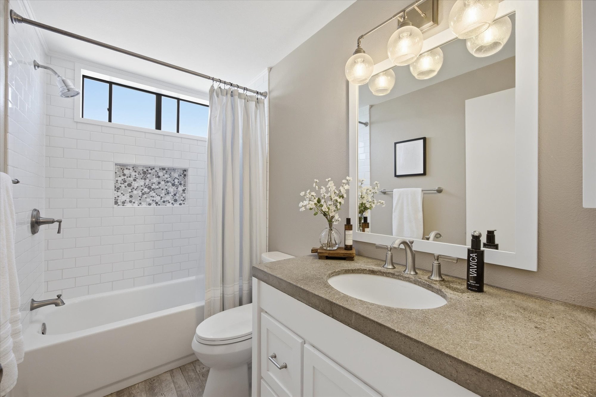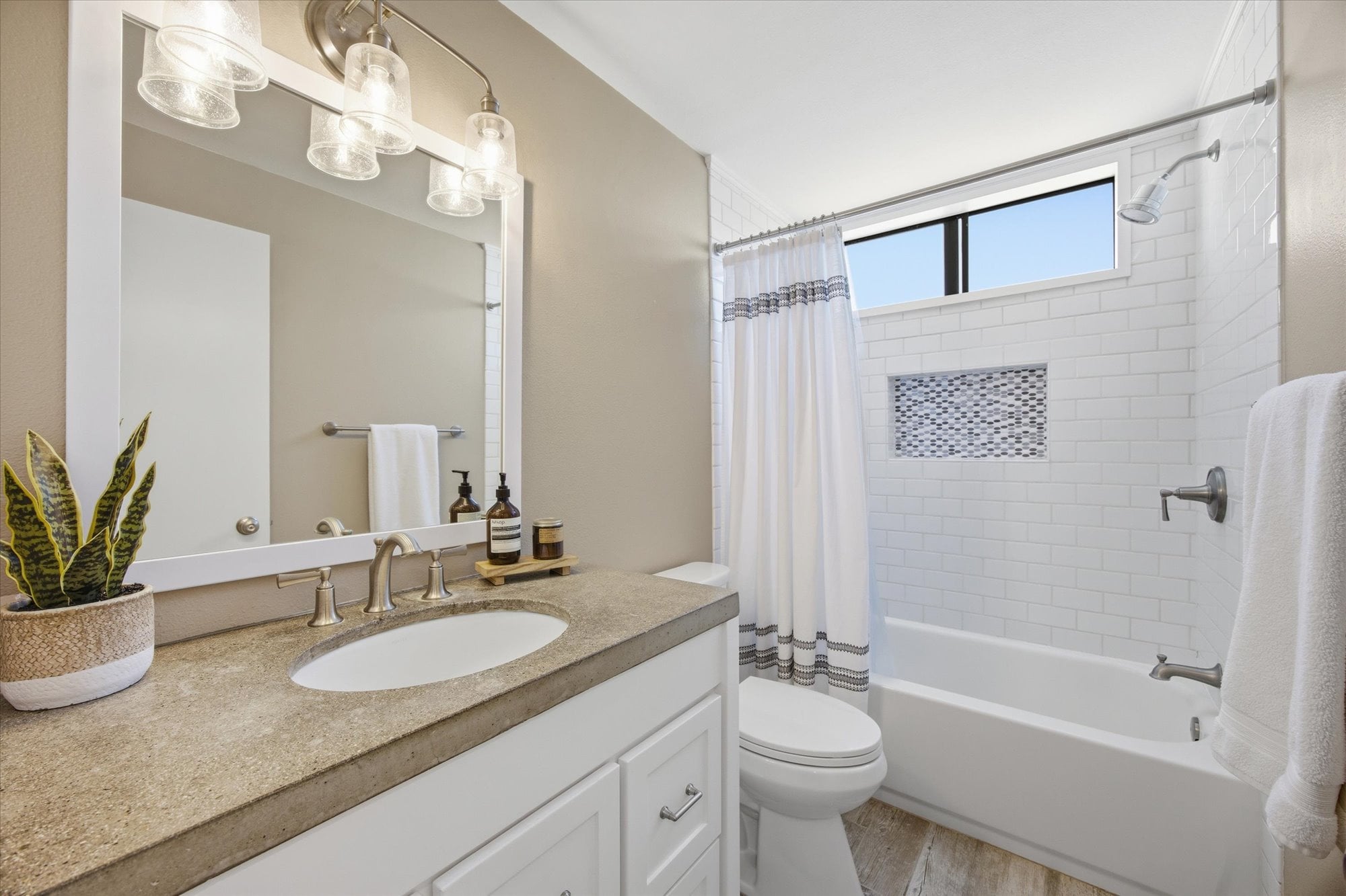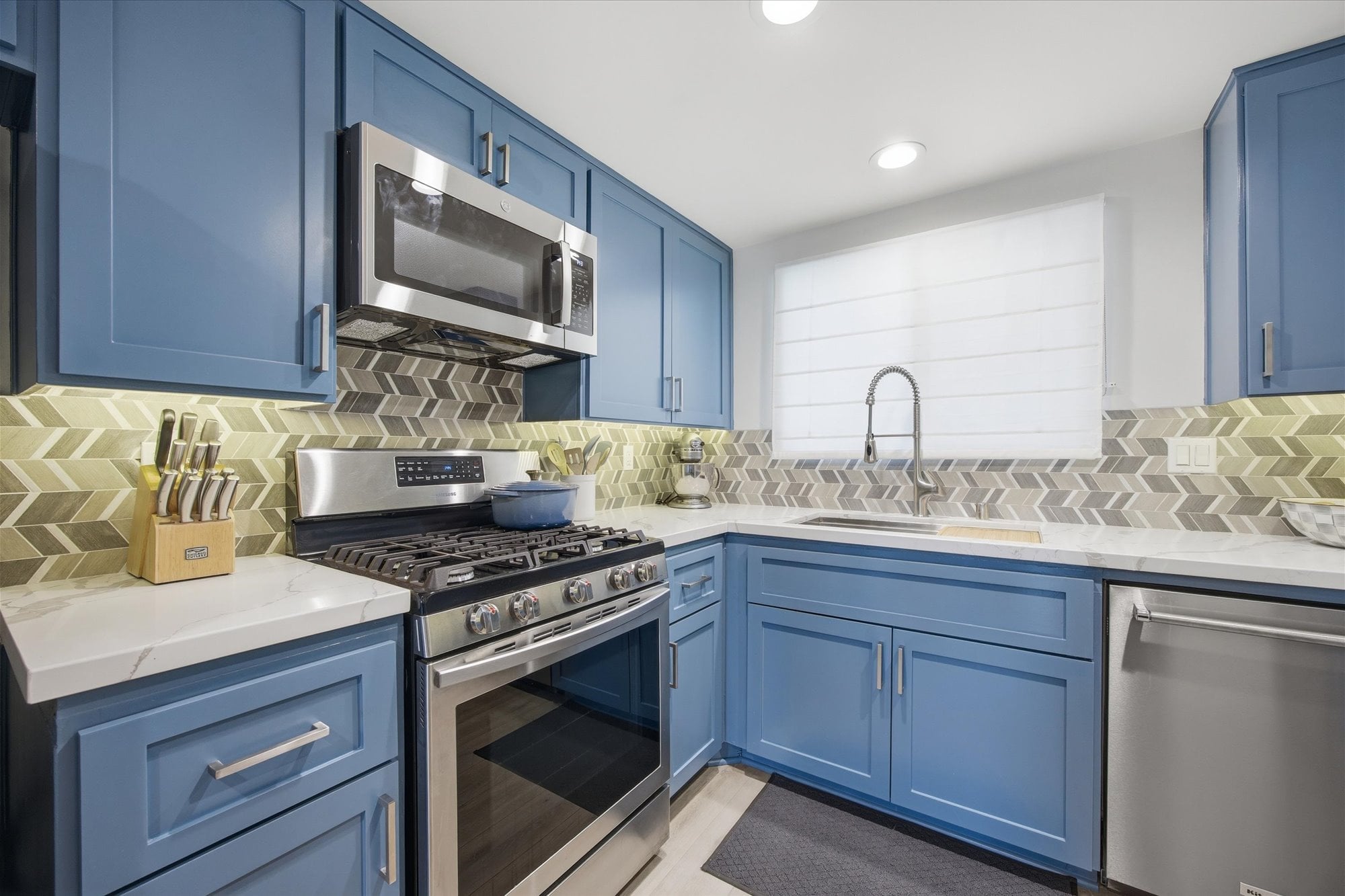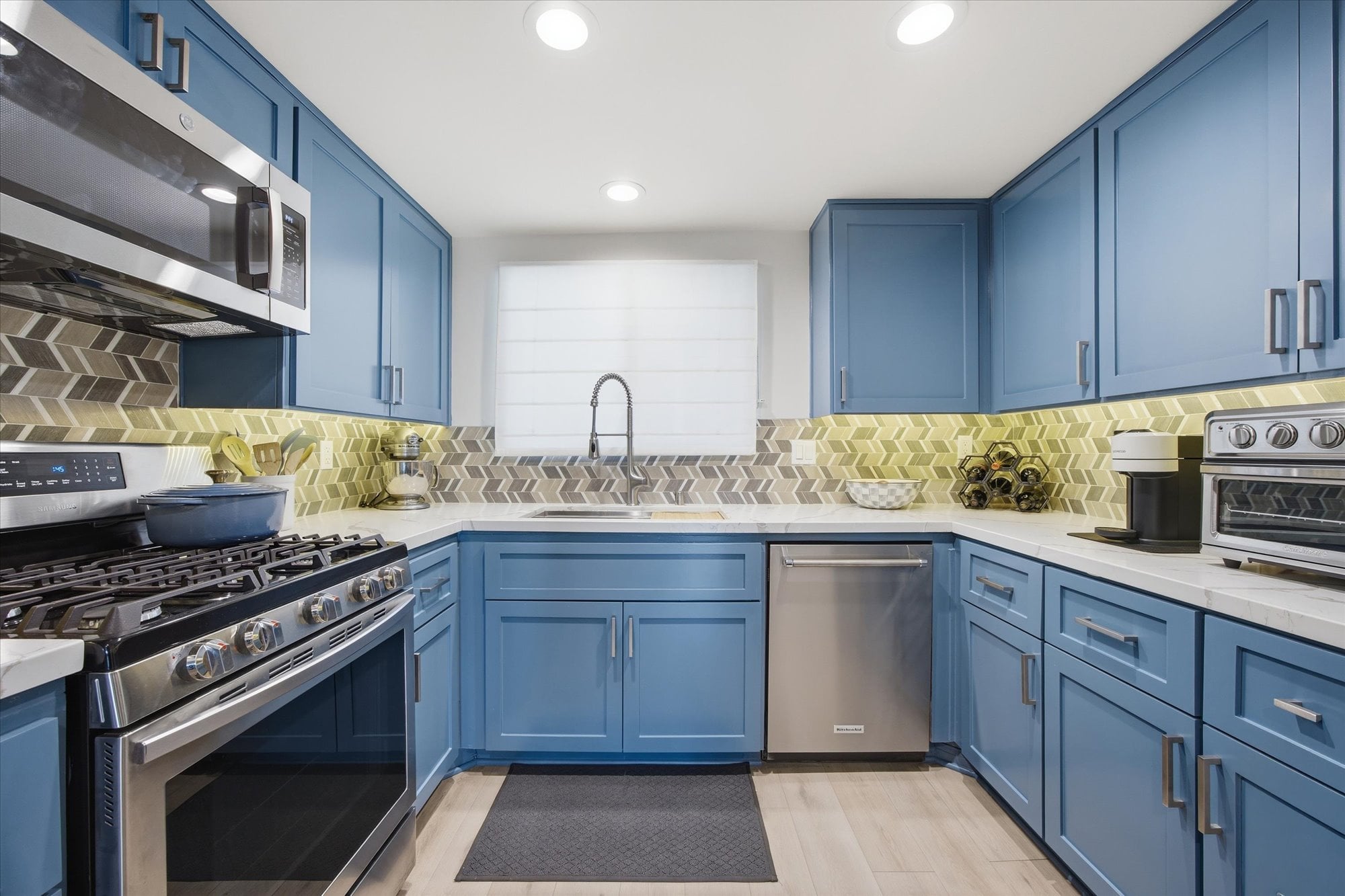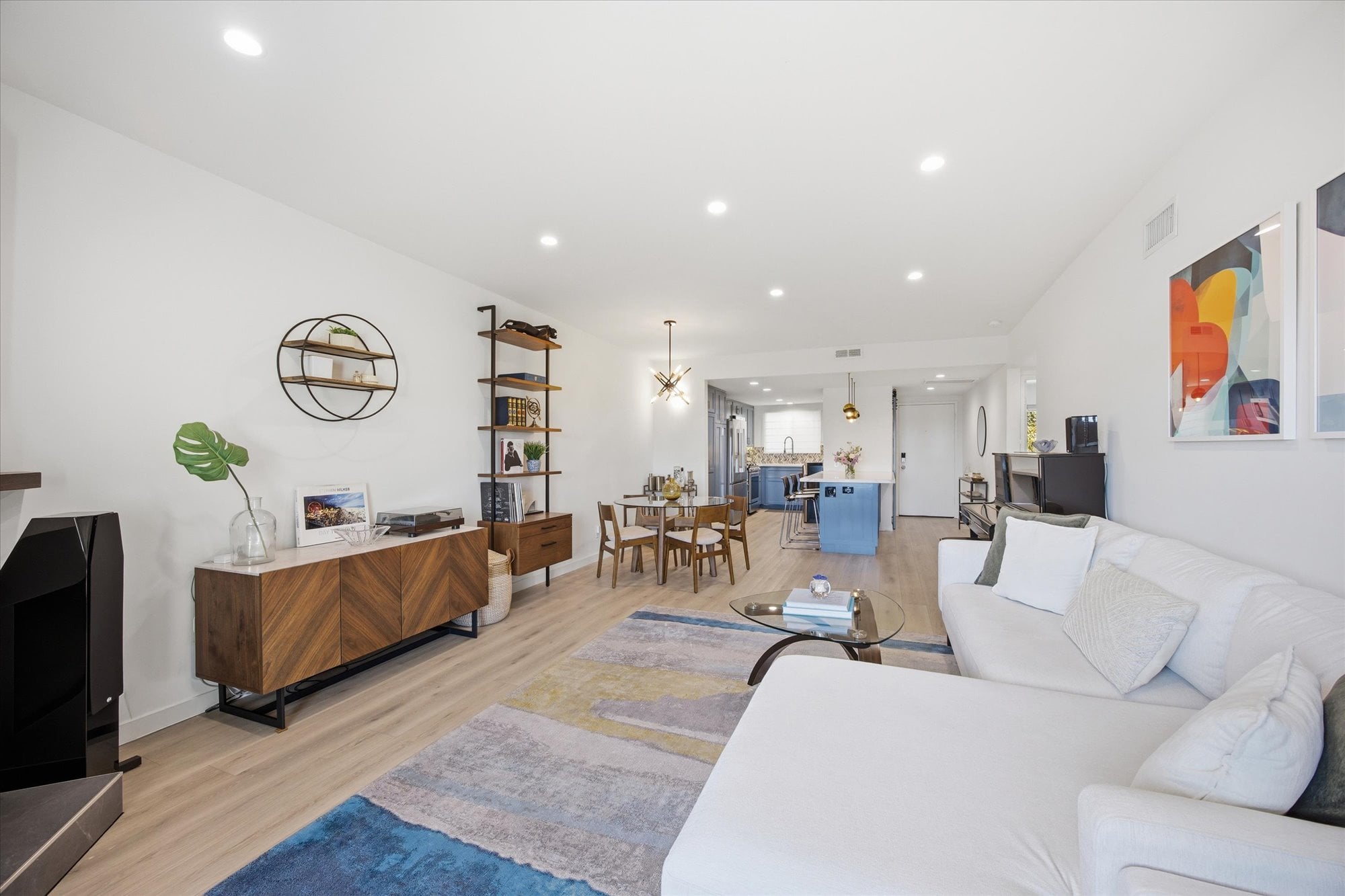 Down the hall, two well-appointed bedrooms offer comfort and privacy, including a spacious primary suite with a walk-in closet, en-suite bath, and direct access to the balcony. Additional thoughtful upgrades include central A/C, recessed lighting connected to a Lutron smart system for effortless app-based control, and an in-unit stacked washer and dryer tucked behind a stylish barn door.