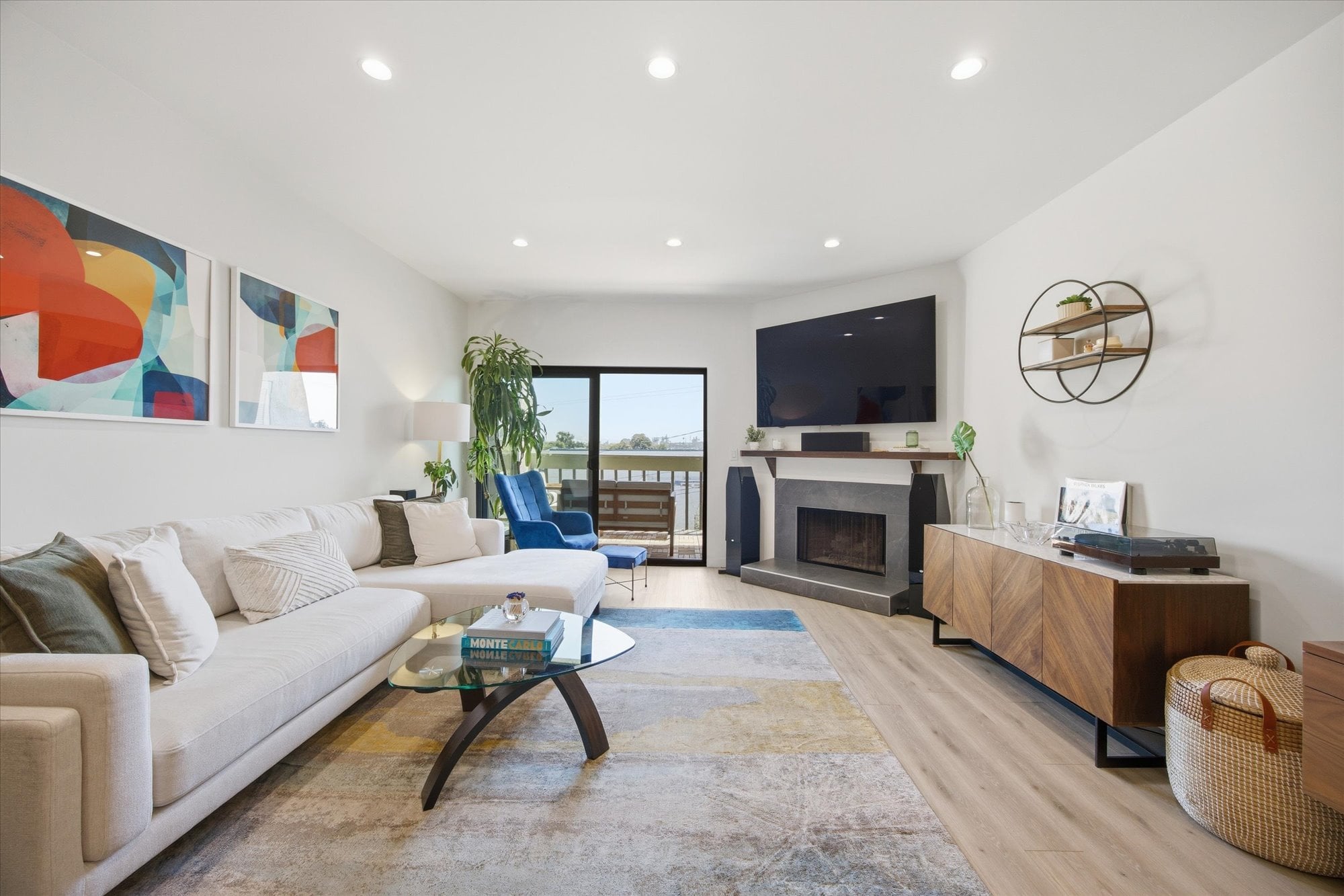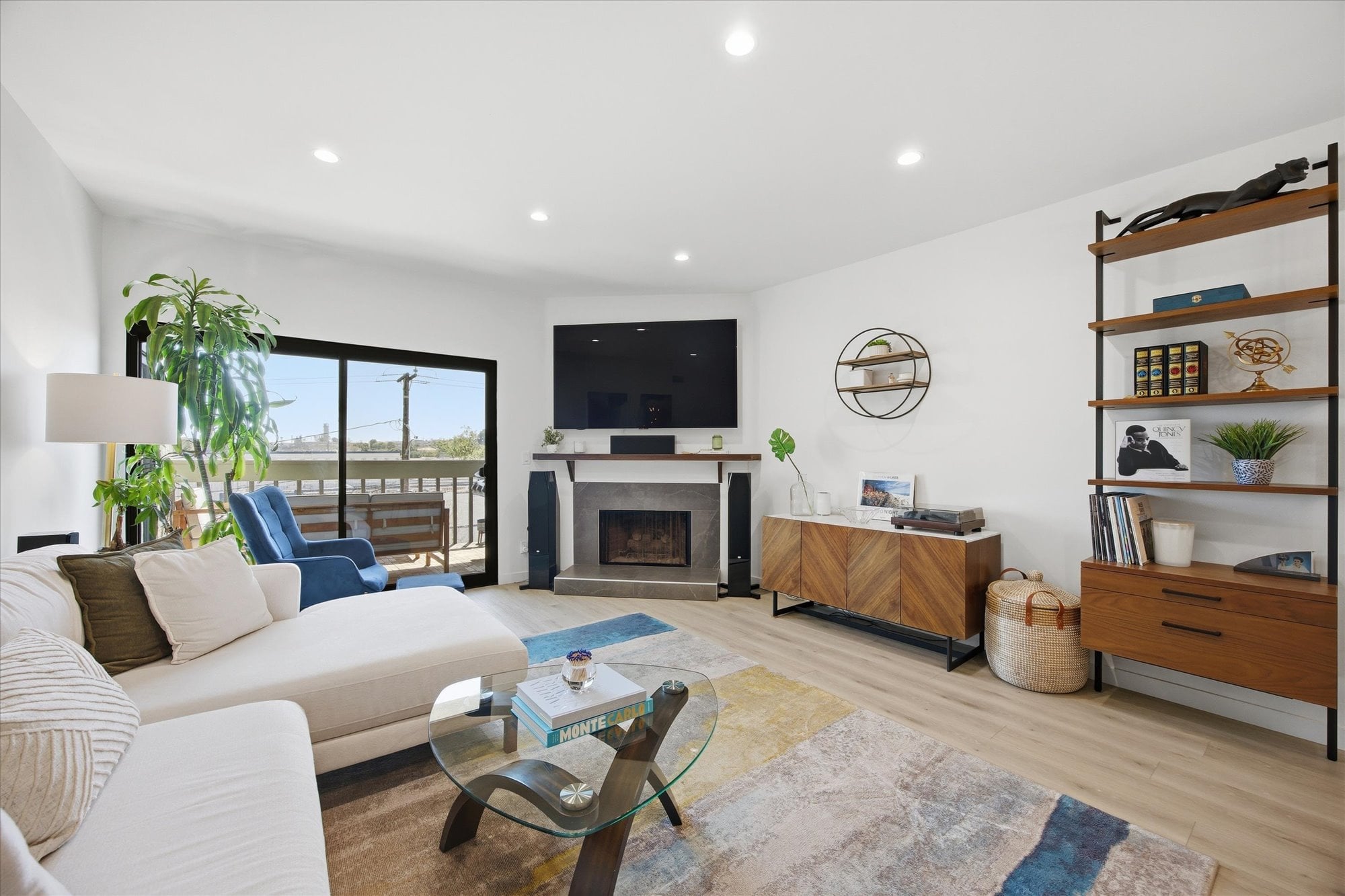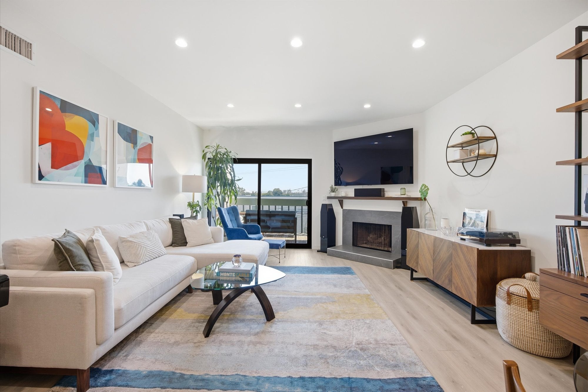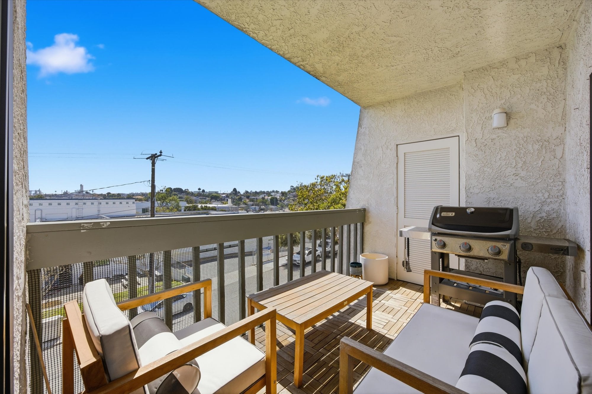 Sunlight fills the living room, where sliding doors lead to a private balcony overlooking the neighborhood, an ideal setting for morning coffee or evening unwinding. The space is also enhanced by in-wall wiring for a 5.1 surround sound system, along with upgraded Cat6 connectivity for high-speed, hardwired internet and seamless streaming.