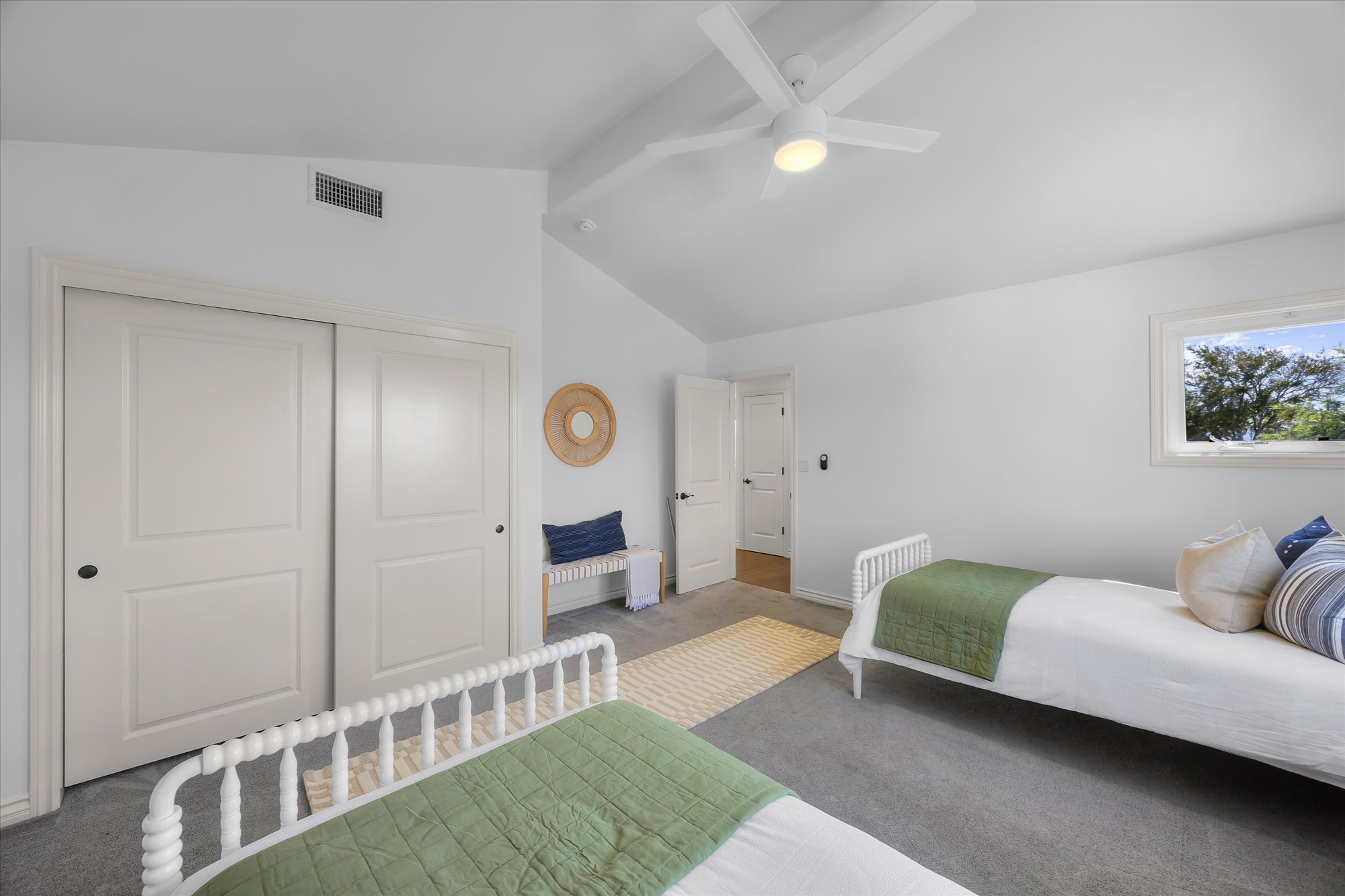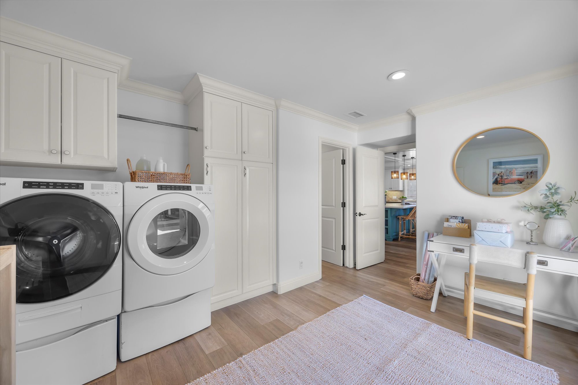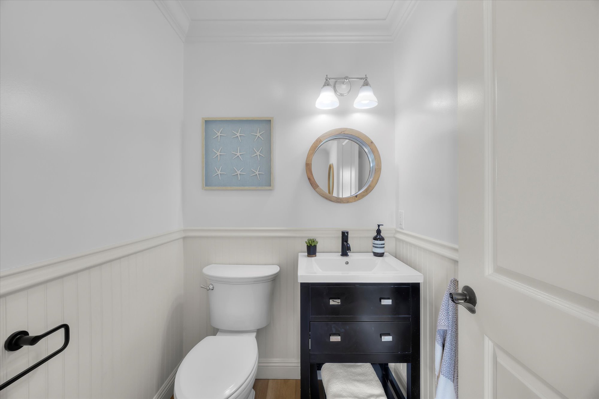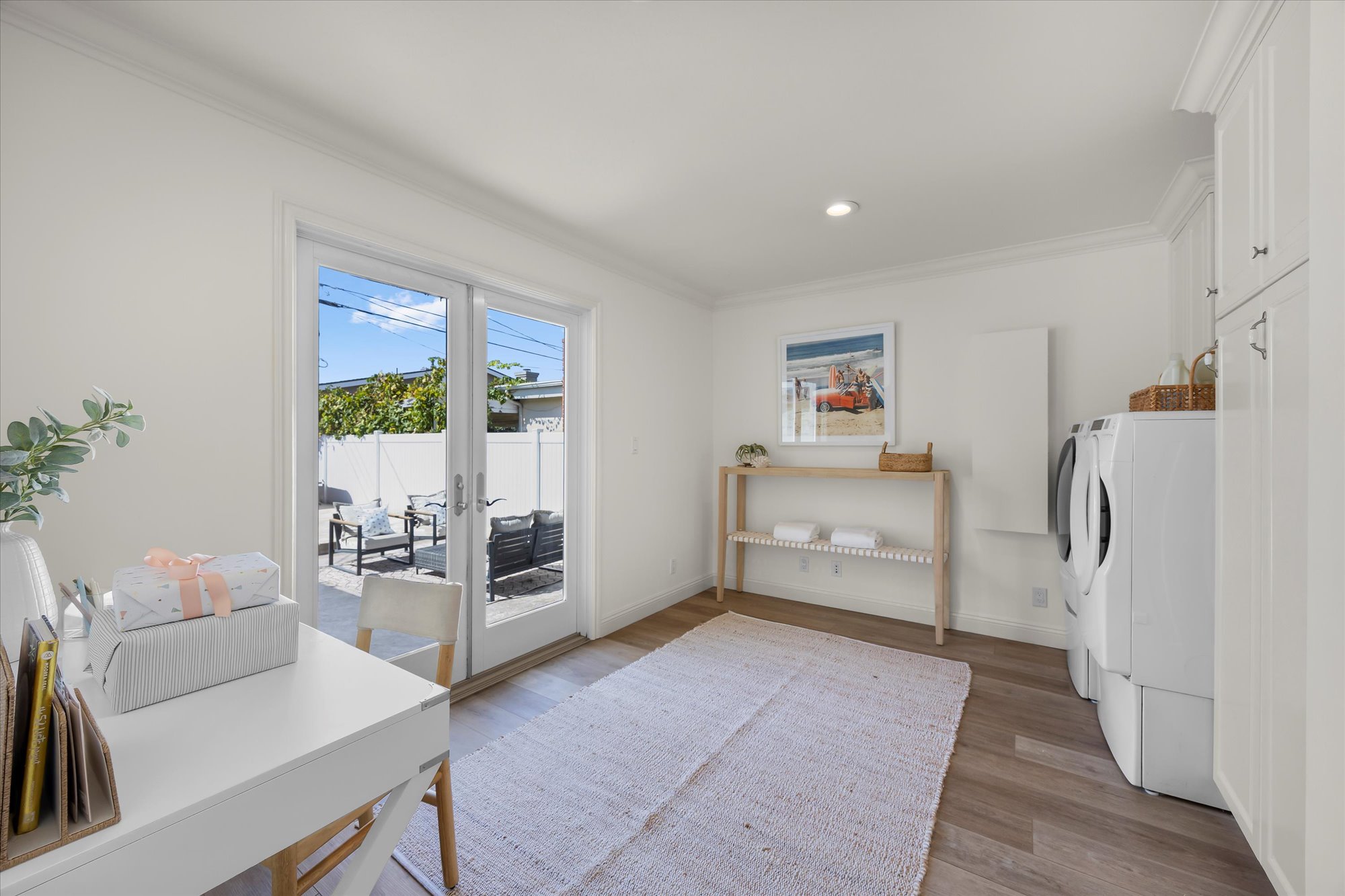 The first floor further includes a versatile laundry room that can double as a creative or flex space, with its own French doors opening to the yard, along with a convenient half bath for guests.