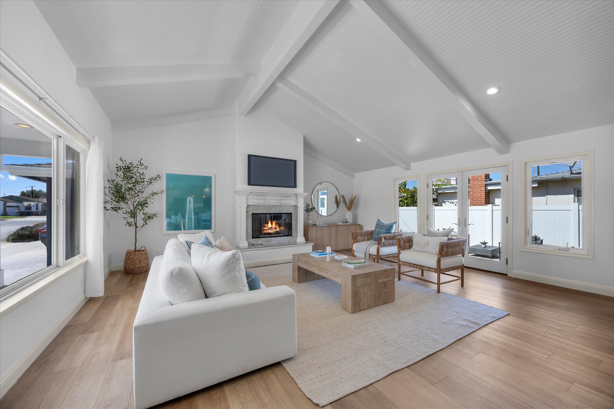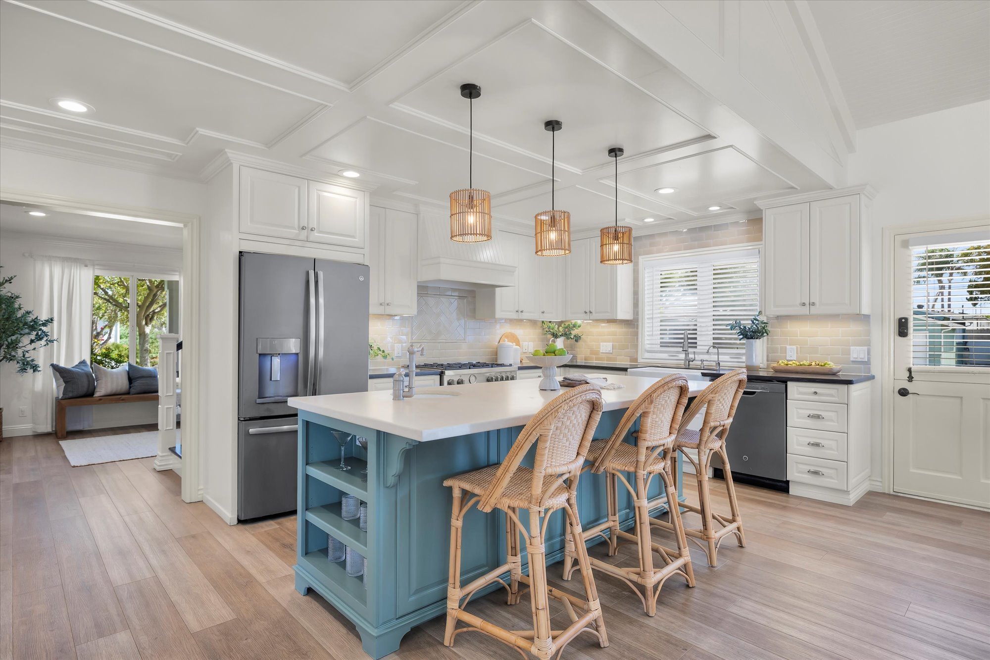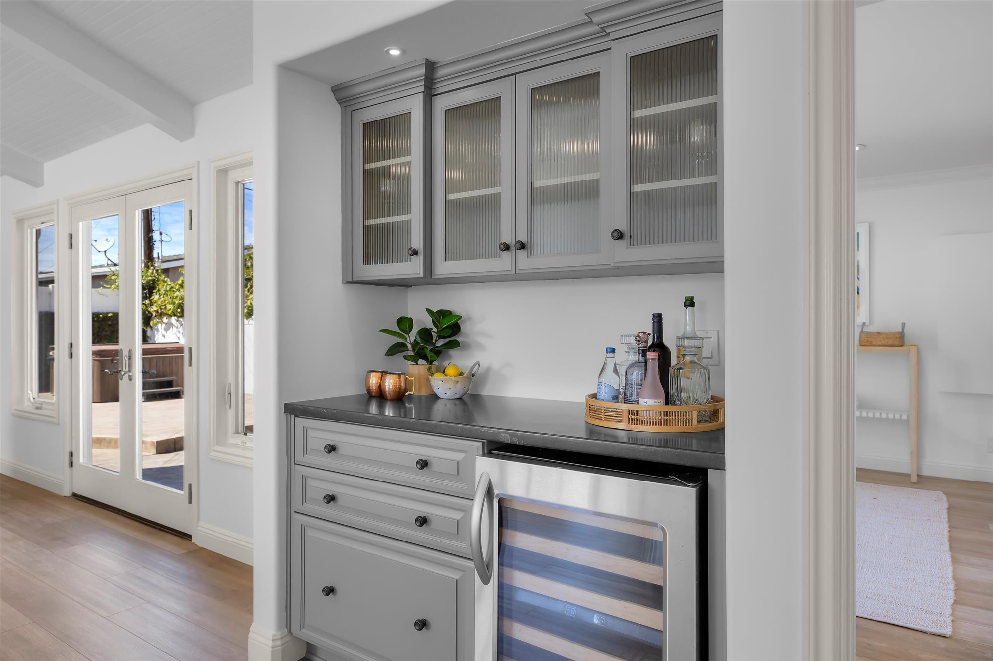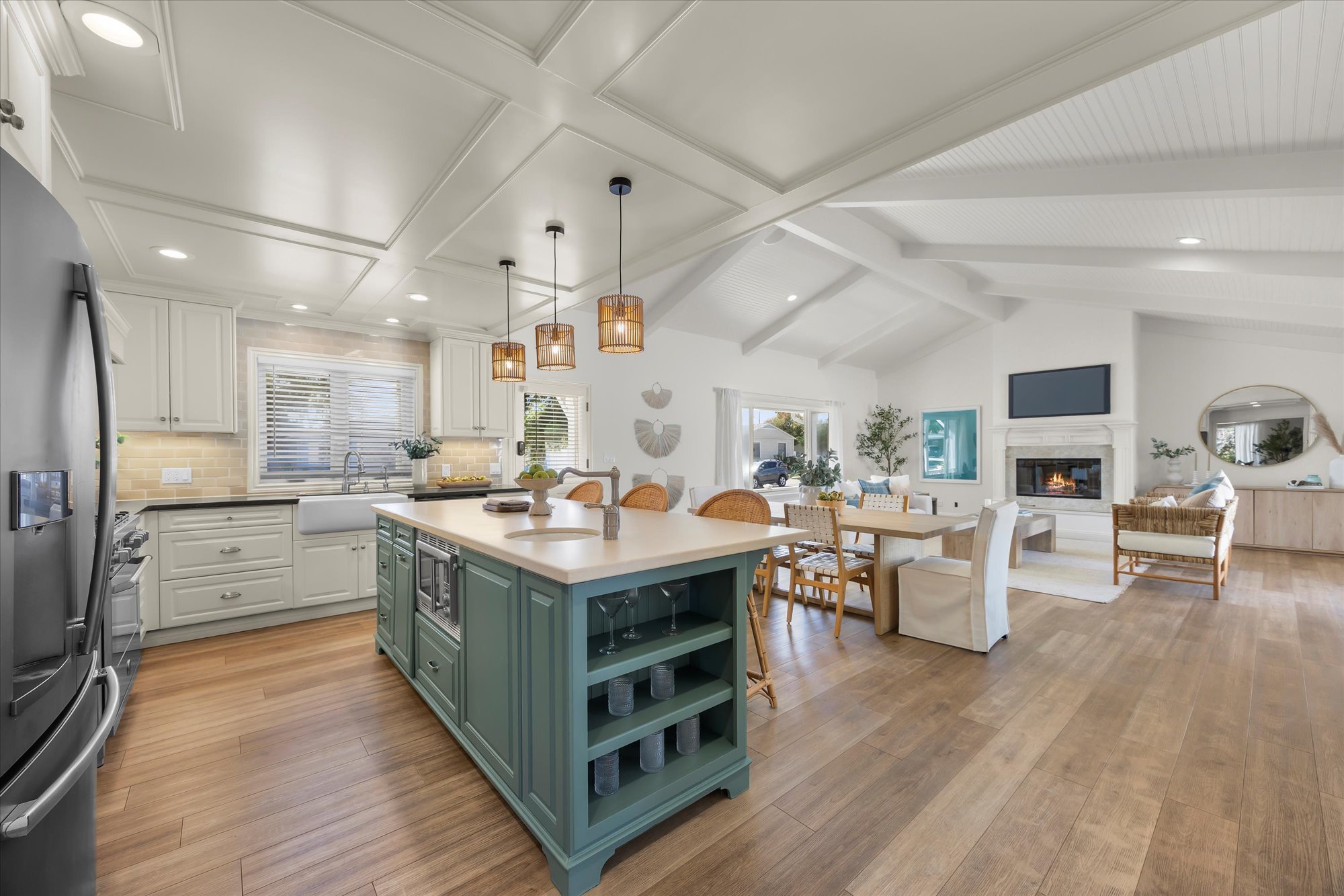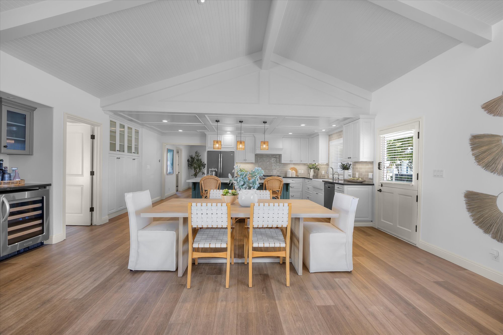 The open-concept floor plan connects the kitchen, dining, and living spaces seamlessly. The kitchen boasts a large island with bar seating and convenient side shelving, stainless steel appliances, and direct flow into the vaulted-ceiling living room anchored by a cozy wood-burning fireplace. Between the kitchen, dining, and living areas is a custom bar nook with a wine fridge, countertop display, and cabinet storage, perfect for entertaining. From this open gathering space, a Dutch door leads to the side of the wrap-around porch, adding both charm and functionality. French doors at the back open to a retreat-like yard with a spacious deck and above-ground spa, ideal for indoor-outdoor living.