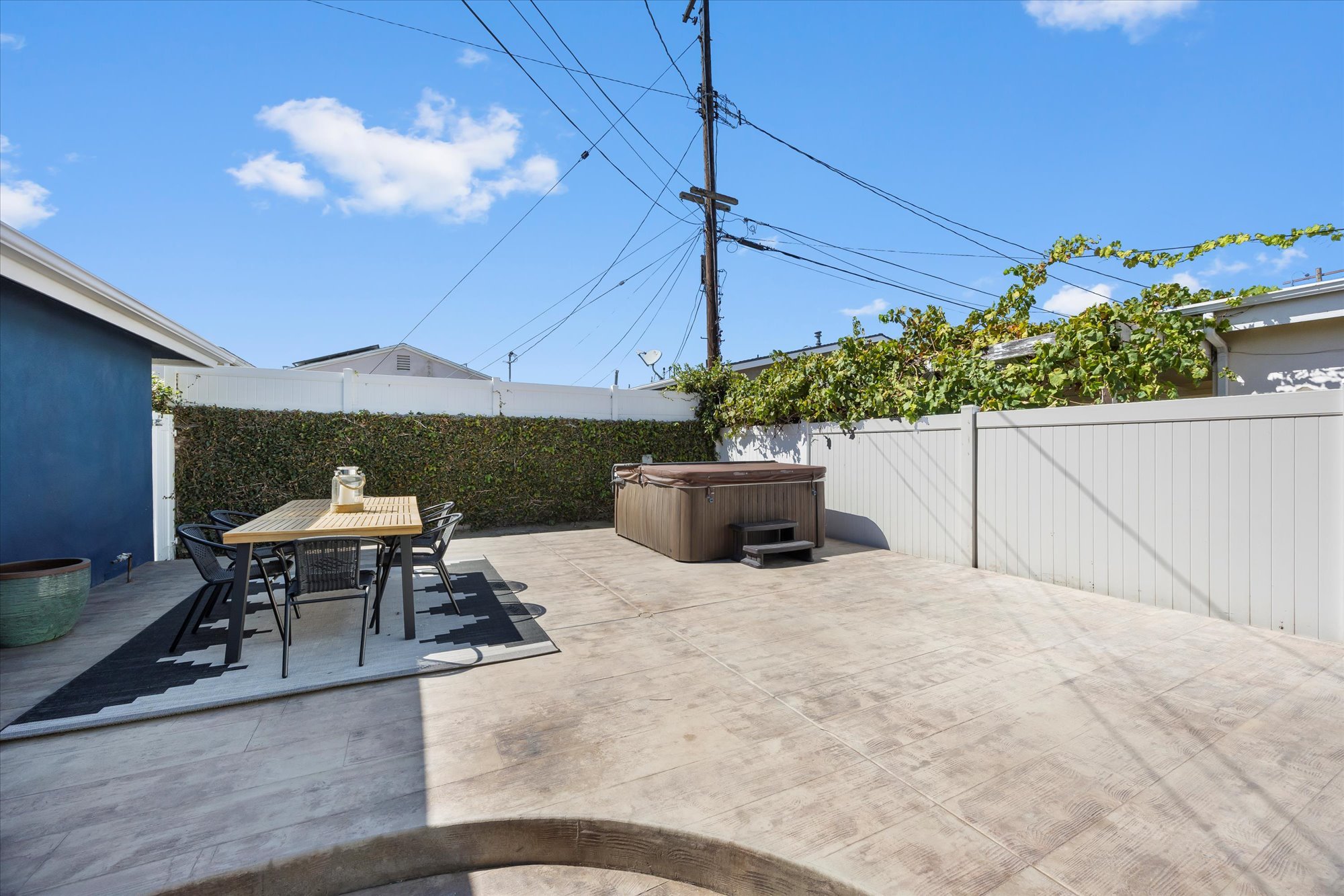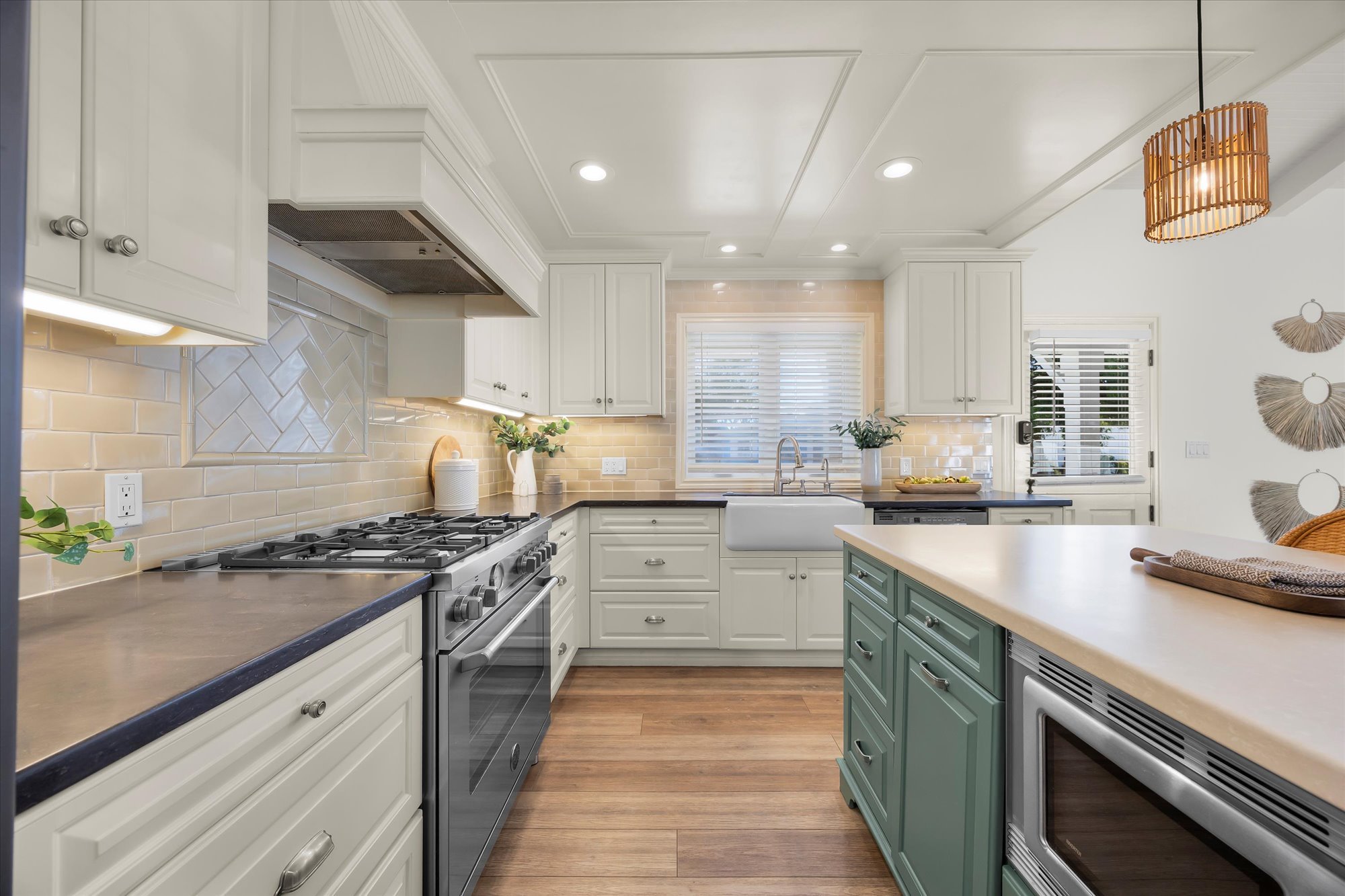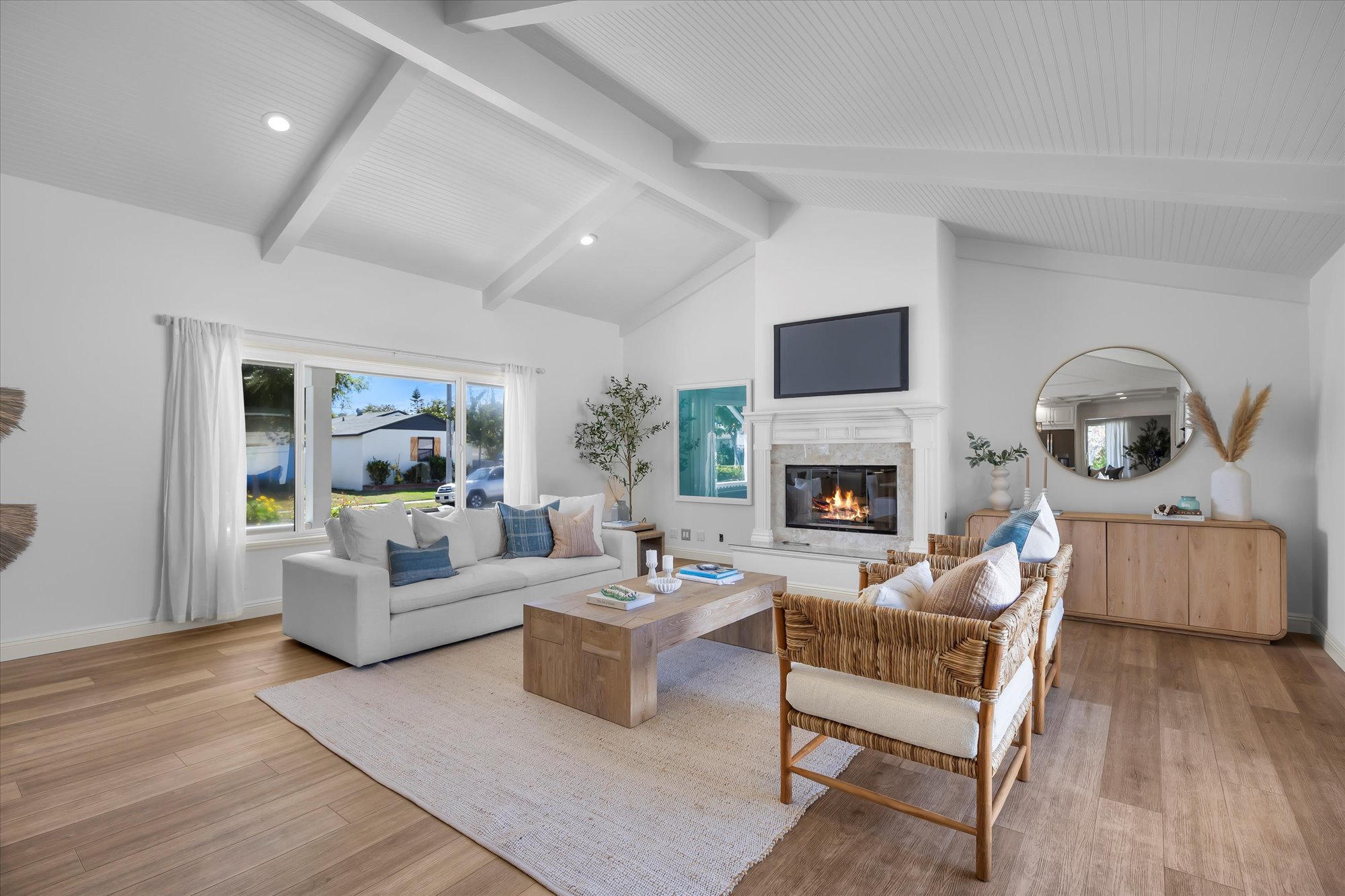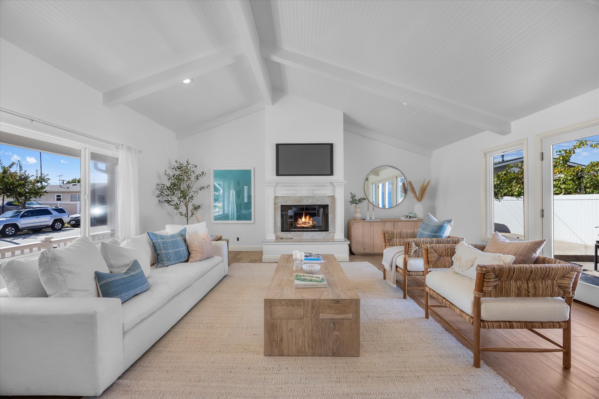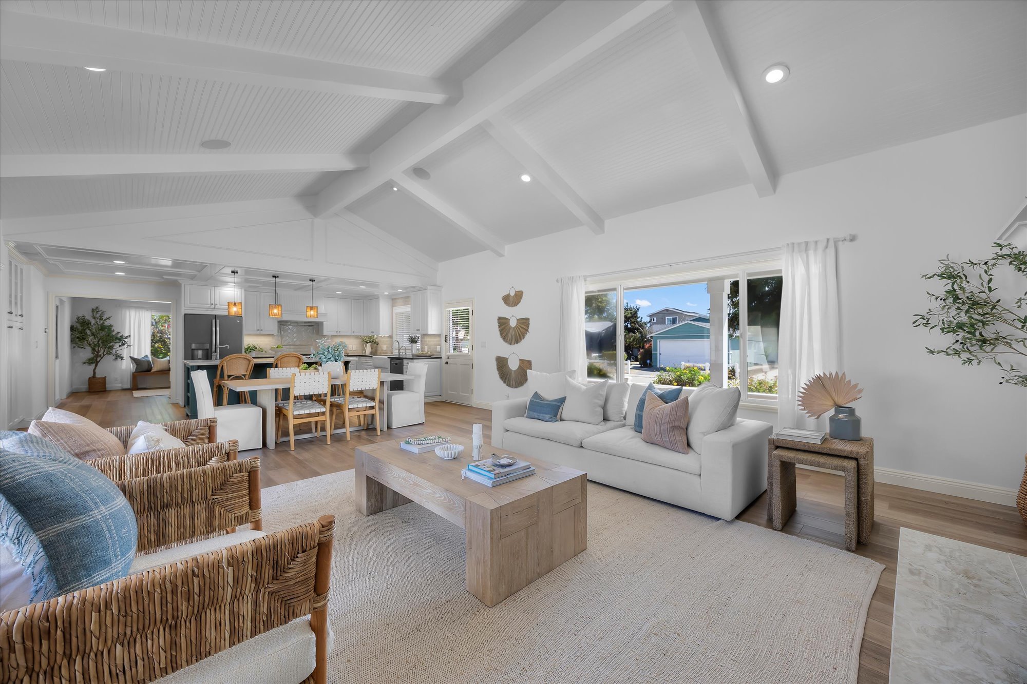 The open-concept floor plan connects the kitchen, dining, and living spaces seamlessly. The kitchen boasts a large island with bar seating and convenient side shelving, stainless steel appliances, and direct flow into the vaulted-ceiling living room anchored by a cozy wood-burning fireplace. Between the kitchen, dining, and living areas is a custom bar nook with a wine fridge, countertop display, and cabinet storage, perfect for entertaining. From this open gathering space, a Dutch door leads to the side of the wrap-around porch, adding both charm and functionality. French doors at the back open to a retreat-like yard with a spacious deck and above-ground spa, ideal for indoor-outdoor living.